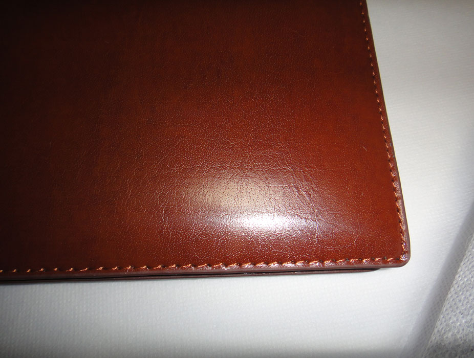 色はブラウンを選びました。実物を見た感想は、「落ち着いた雰囲気のきれいな茶色でなかなかいい感じ」でした。再生皮革ですが、安っぽい感じはなく、そこそこ高級感があり、素材感も合格点です。