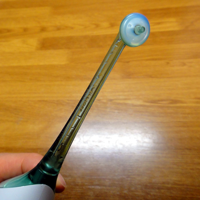 「歯ぐきから血が出る」「舌に当たると痛い」などというショップの書き込みや口コミをみて、すごい勢い、威力のある水が噴射されるのかと思っていましたが、実際にはビックリするような水圧ではありません。気持ちイイぐらいの水圧ですね。水圧の強さを選べて、もうちょっと水圧が強くてもイイかなとも思いますが、あまり強すぎるのは危険かもしれませんね。
