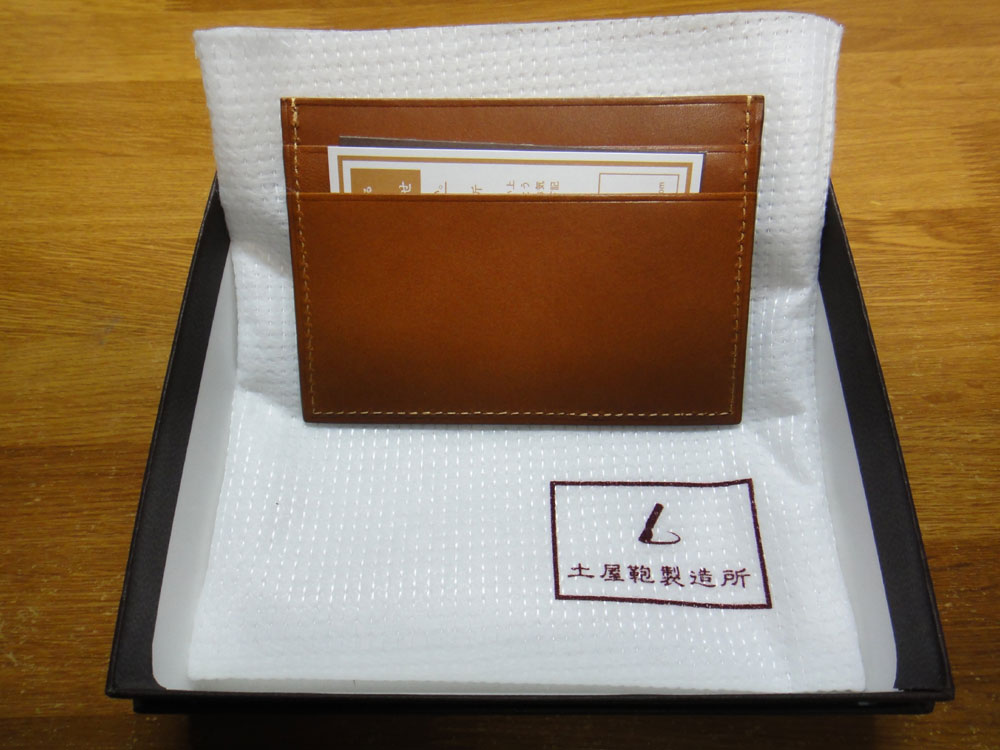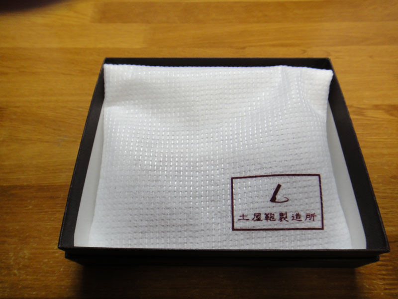 土屋鞄のヌメ革名刺入れを買った時と同様に、土屋鞄製造所のロゴ入りの箱で中身の半分ぐらいは緩衝材ですね。いつもながら丁寧な梱包です。落ち着いた上品な外箱も結構好みです。