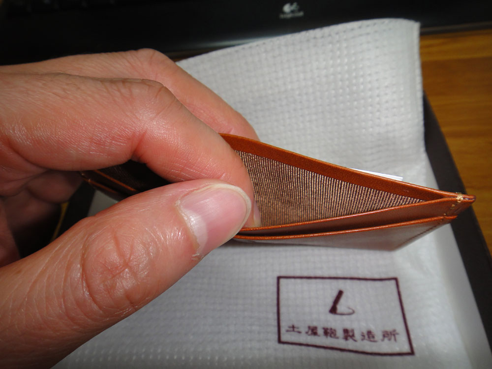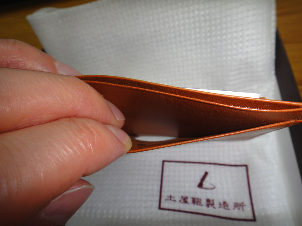 革が馴染んでくるとどうか分かりませんが、新品の状態ではピチッとしているのでカードを入れる感じは少し硬めで、そのおかげでカードは落ちにくいですね。馴染んだらどうなるかは使い込んだ後、また報告したいと思います。